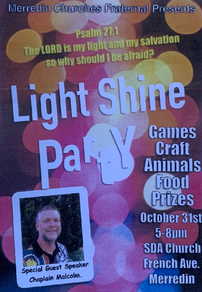 This year the Merredin Churches Fraternal will again be holding the annual light shine party. Every year this is held at the Seventh Day Adventist church on French Avenue. It will begin at 500pm and finish at 800pm on the 31st of October. There will be games, craft, food, animals and prizes.